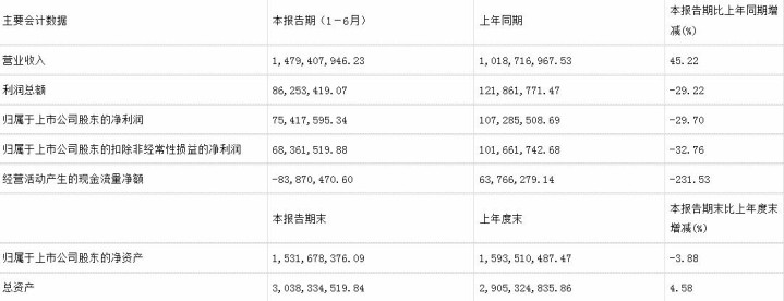另一方面,富佳股份最新半年报显示,公司报告期内实现营业收入约14.79亿元,同比增长45.22%;然而归母净利润约0.75亿元,同比下降29.70%;扣非净利润约0.68亿元,同比下降32.76%。更值得关注的是,经营活动产生的现金流量净额为-0.84亿元,同比大幅下降231.53%。